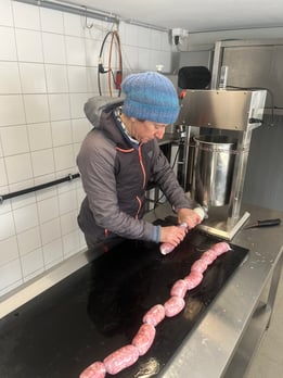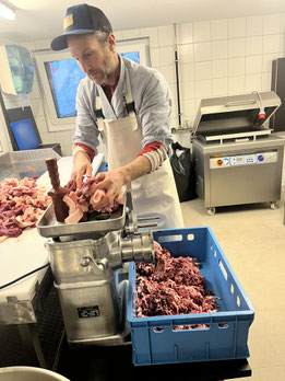 2023 haben wir bei uns auf dem Hof eine Meztgerei eingerichtet. Wir hatten das Glück von einem erfahrenen Metzger angelernt zu werden, er unterstützt und auch jetzt noch. So wird nun im Frühling und Herbst das Frischfleisch verarbeitet und zu Mischpaketen zusammengestellt. Im Winter wird Kuhfleisch zu Wurstwaren verarbeitet.